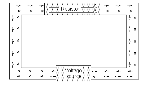 Since there is practically no potential difference along the conductors but mainly across the resistors, it can be concluded that the electric field within the resistor will be much larger than within the conductors. Where does this extra field within the resistors come from? Which of the following answers do you think is correct or makes sense to you?